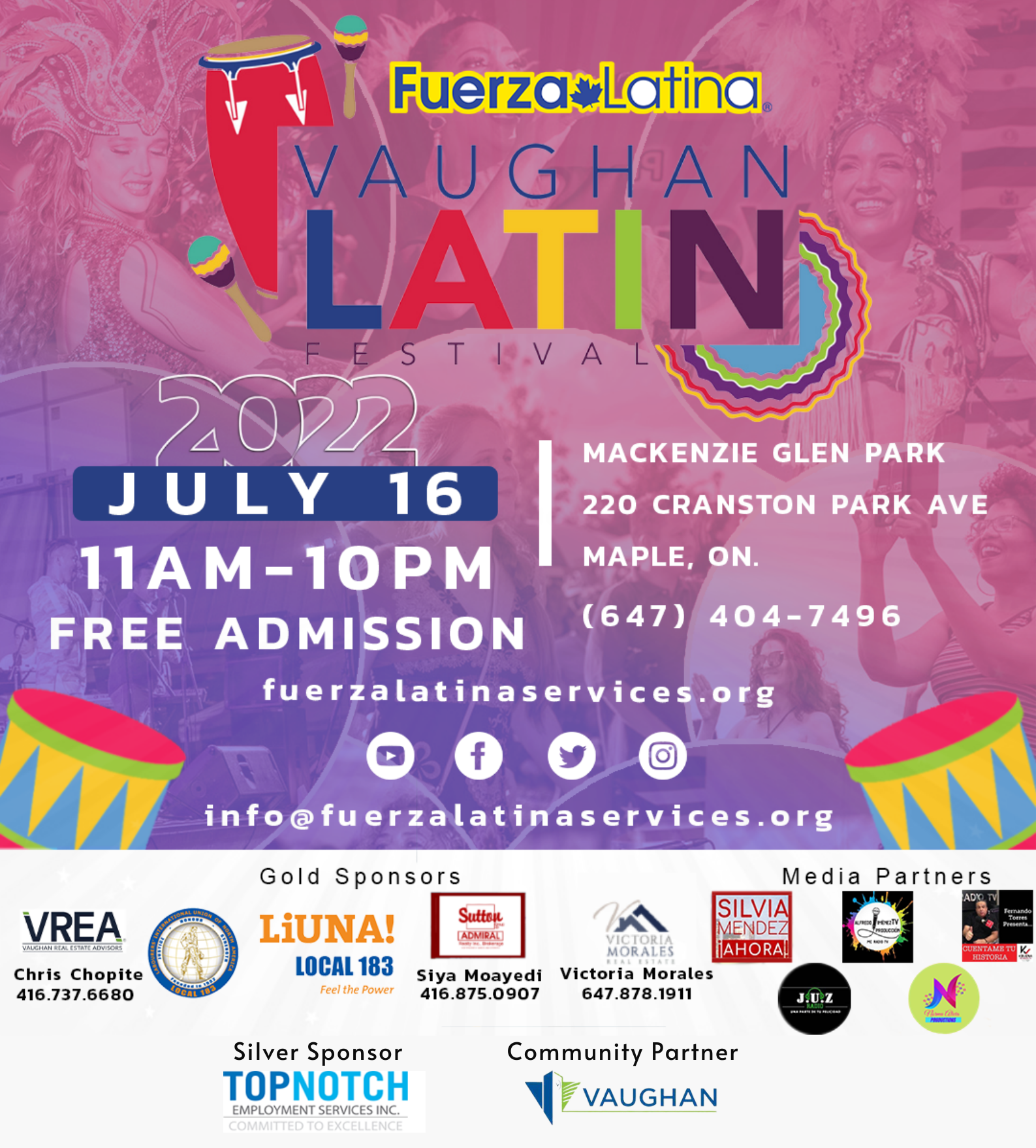 Vaughan Latin Festival Saturday, July 16, 2022 11:00 AM 10:00 PM 11:00 22:00 Vaughan Latin Festival 220 Cranston Park Avenue Maple, ON, L6A 2M4 Canada (map) Google Calendar ICS